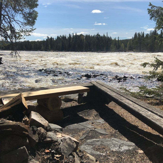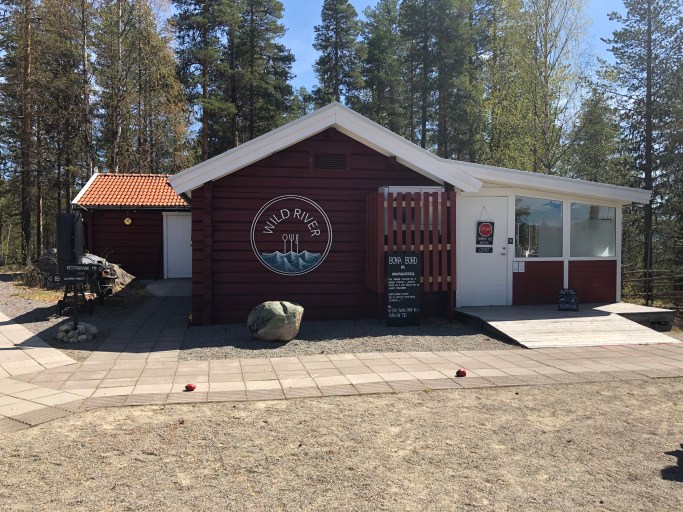 Ovanför forsarna ligger Restaurang Wild River, det finns en trapp om du står nere vid forsen.