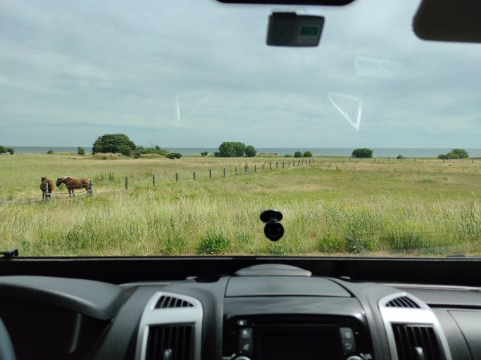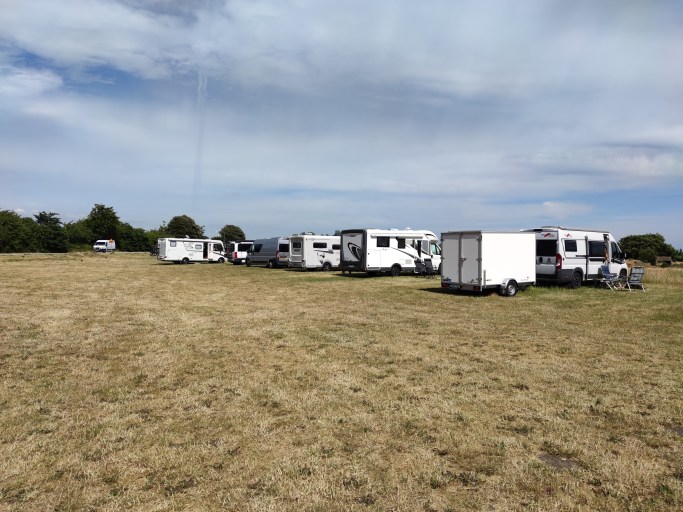 Det finns en stor välklippt åker att ställa upp ekipagen på, med utsikt mot havet och hästar som vandrar i hagen.